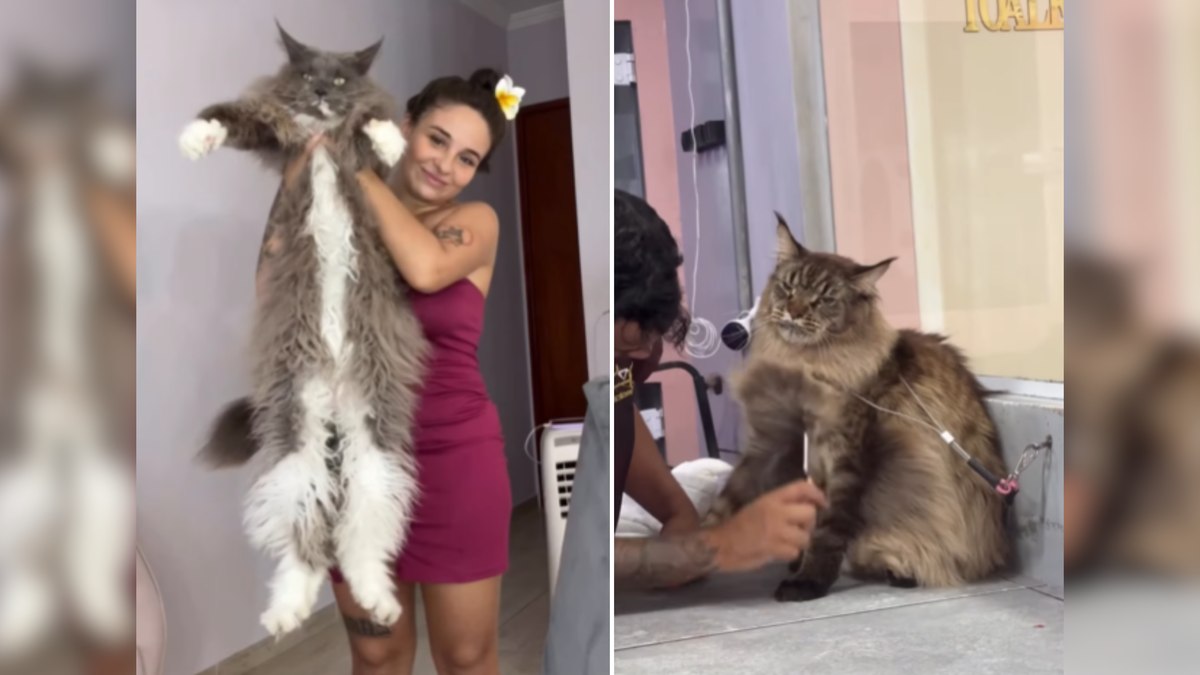 O vídeo, que já ultrapassa 7,5 milhões de visualizações, mostra o felino em diversos momentos do dia a dia e impressiona pela sua proporção: ao ser carregado pela tutora, o animal aparece esticado, quase do tamanho dela.