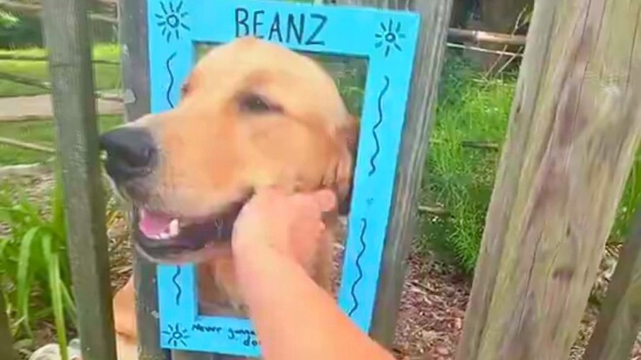 O fenômeno começou quando Caroline Clark, moradora local, compartilhou em seu TikTok um vídeo de Beanz interagindo com quem passava. Nas imagens, o cão coloca a cabeça pelas aberturas de uma cerca colorida, recebendo carinho e atenção de todos que se aproximam.