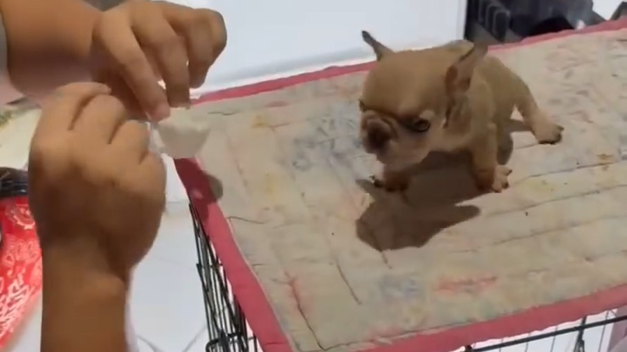 Isso porque o cachorrinho não gostou nem um pouco da ideia. Sua reação foi imediata e surpreendente para quem assistia. O filhote, da raça buldogue francês, reage tentando impedir a ação da tutora.