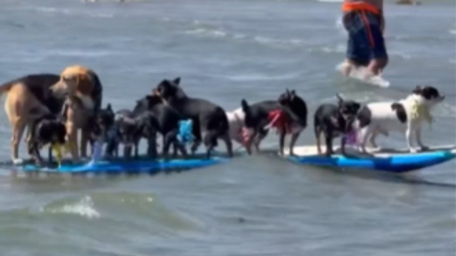 Um vídeo inusitado vem viralizando nas redes sociais ao mostrar cerca de dez cães surfando juntos em uma única prancha em San Diego, Califórnia.