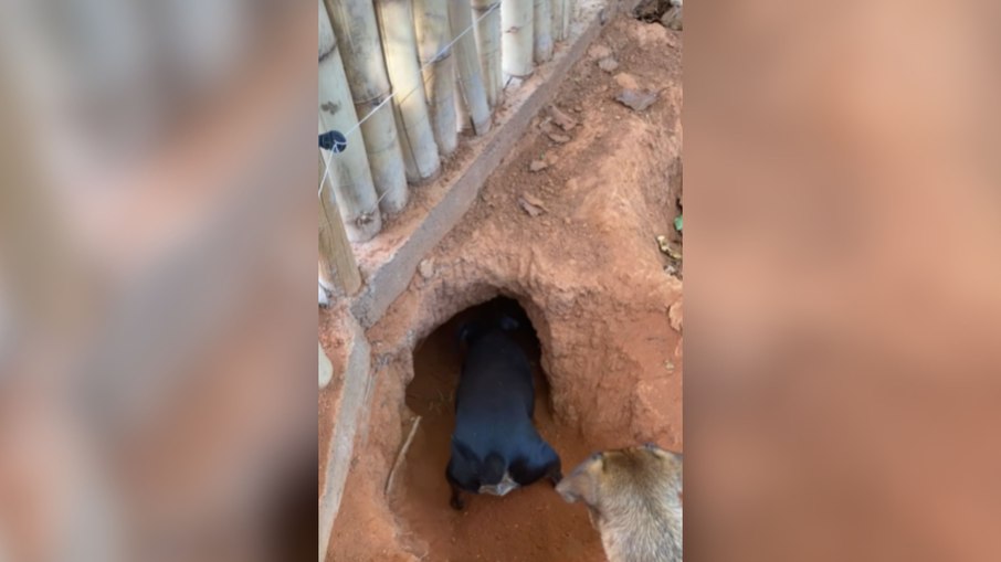 Sozinha com 22 cães resgatados, ela acabou registrando um momento que resume bem a energia da casa: a abertura de um túnel coletivo no quintal.