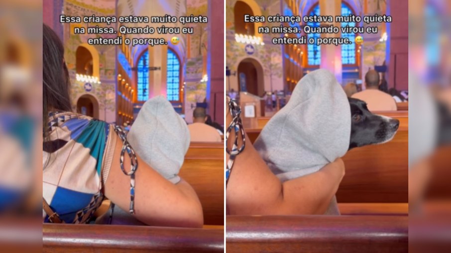 A surpresa acontece quando a “criança” vira de lado, revelando que não se tratava de um bebê, mas do cachorro Oreo, acomodado dentro do agasalho e fazendo companhia à tutora no banco da igreja.