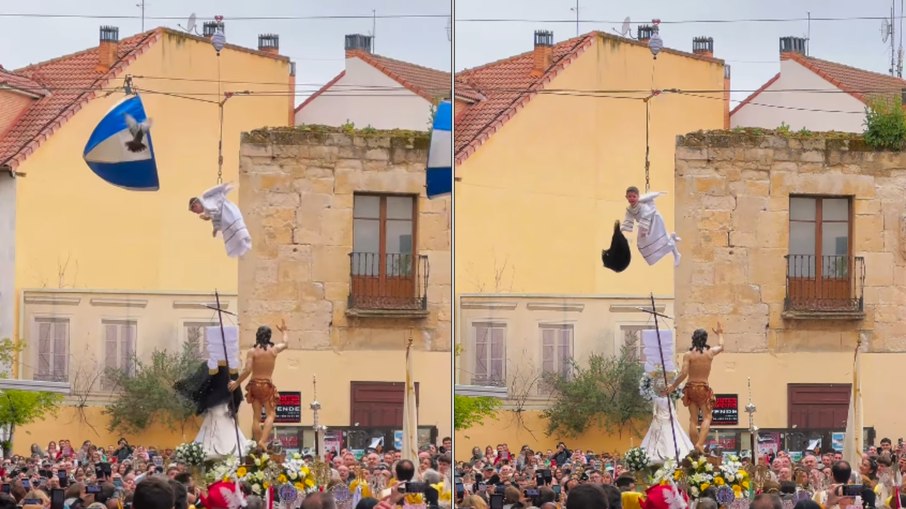 Um menino fantasiado de anjo ficou preso no ar com pombos durante a tradicional "Bajada del Ángel", celebrada no domingo de Páscoa em Aranda de Duero, na província de Burgos, na Espanha. A cena inusitada chamou atenção nas redes sociais e gerou curiosidade sobre o evento religioso, que simboliza a anunciação da ressurreição de Jesus à Virgem Maria.